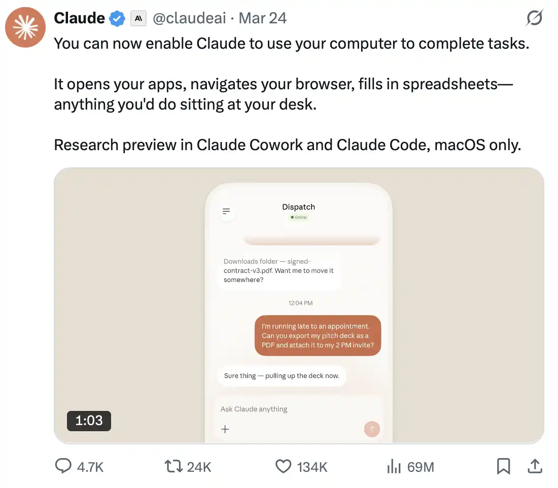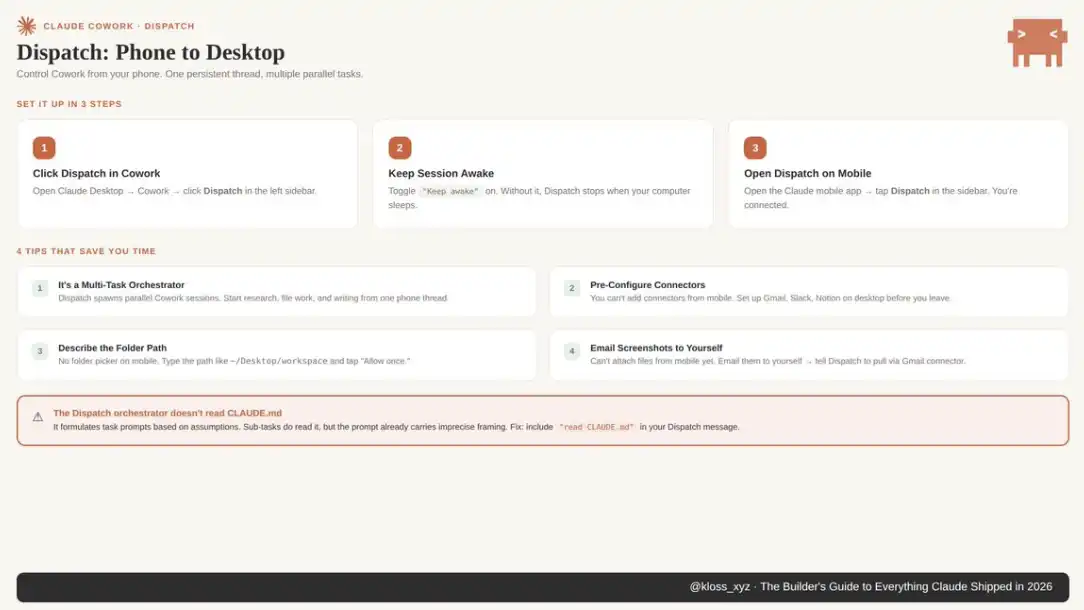 对于知识工作者而言,Cowork 从本周起就会重塑你的日常工作方式:搭建上下文文件体系,设置全局指令,安装两款插件,所有任务优先使用 AskUserQuestion,配置一个定时任务。借助 Dispatch 打通手机与桌面,碎片时间将转化为有效产出;而最新上线的 Computer Use,则进一步扩展了自动执行的边界。