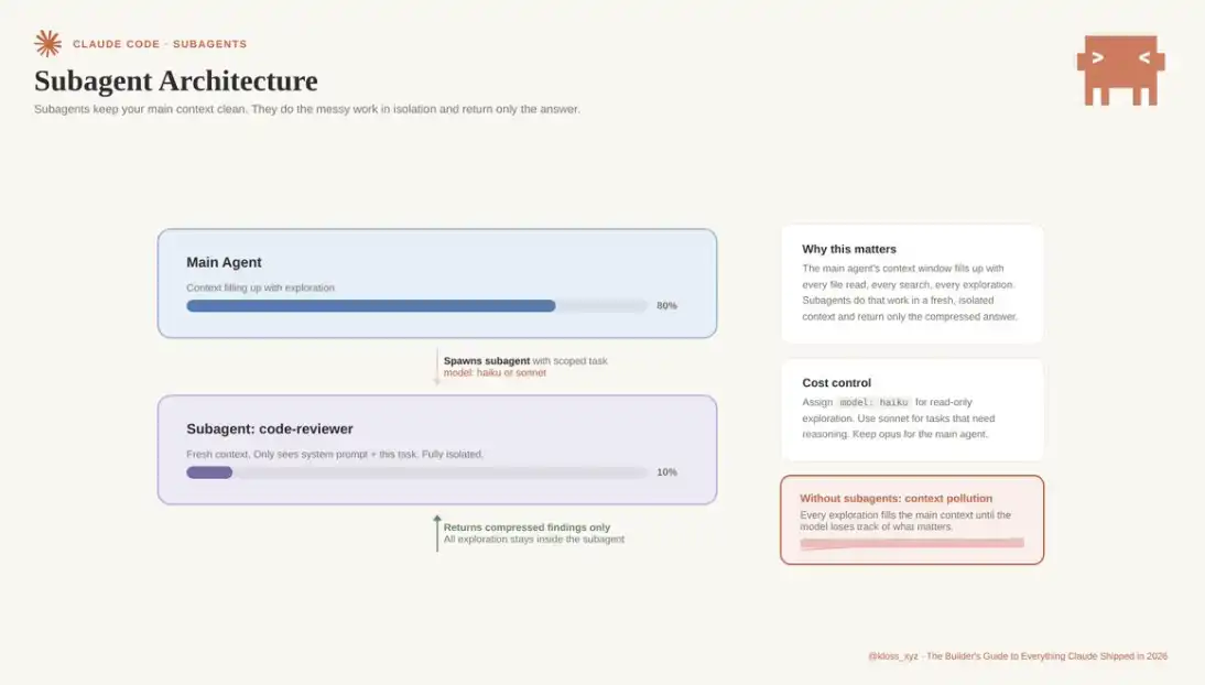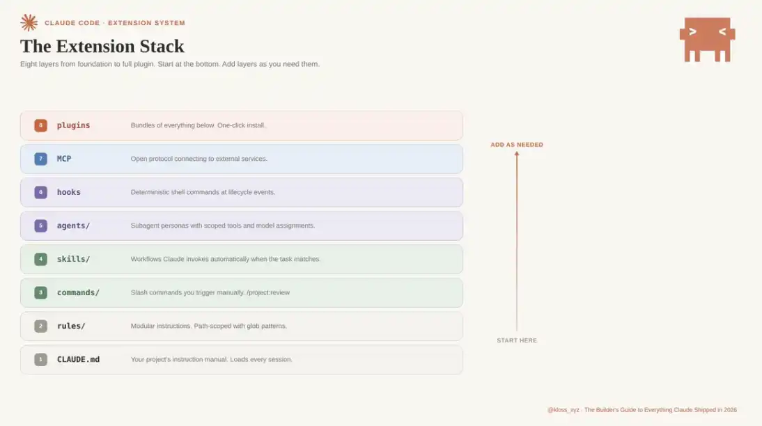 对于基于 Claude 开发产品的构建者而言,真正的杠杆在于其扩展体系:Skills、子代理、Agent Teams、Hooks、Channels、MCP、插件。