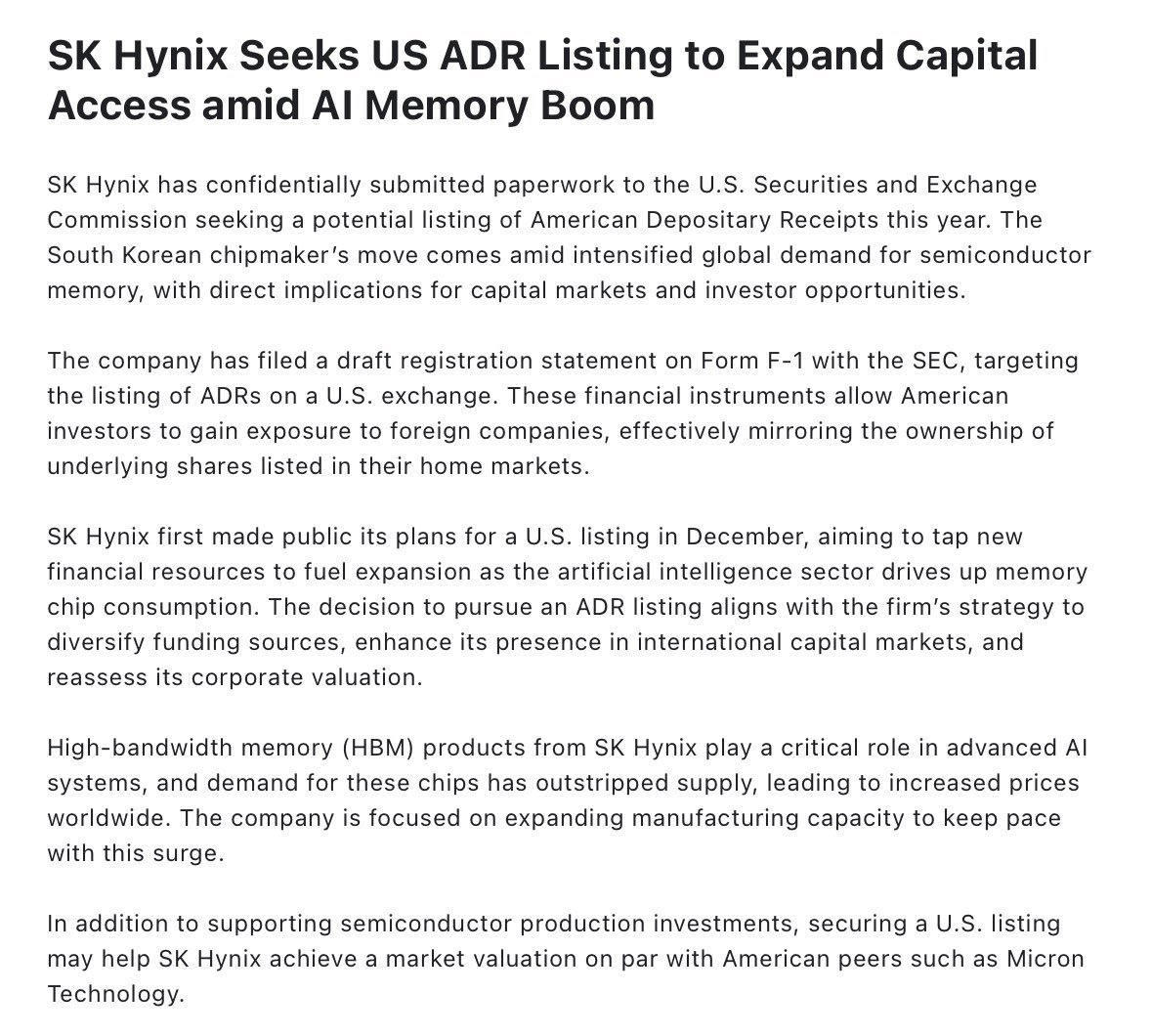 但这件事更重要的地方并不只是多了一个交易渠道,而是海力士想借着这一轮 AI 带来的高带宽内存需求爆发,把自己从韩国市场里的传统存储芯片公司,重新放到美国资本市场里定价。