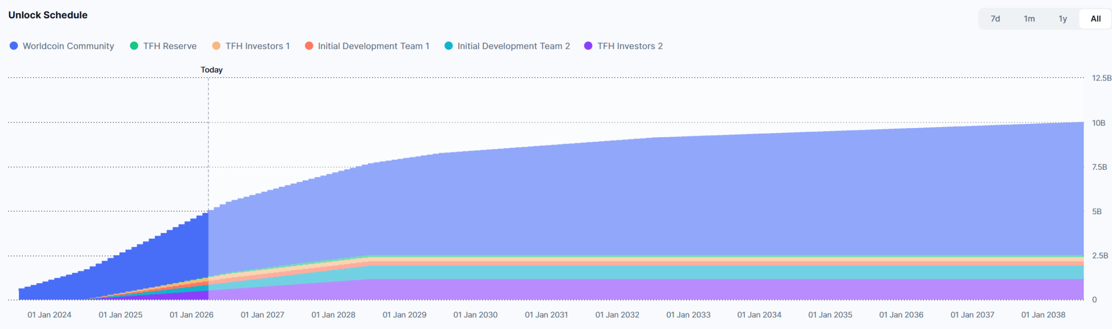 此外,WLD 每日仍解锁最大供应量的 0.05%,约 532 万枚代币,价值约 147.9 万美元。按此计算,每个月解锁的代币价值约 4436.9 万美元,预计仍会给市场造成不小抛压。