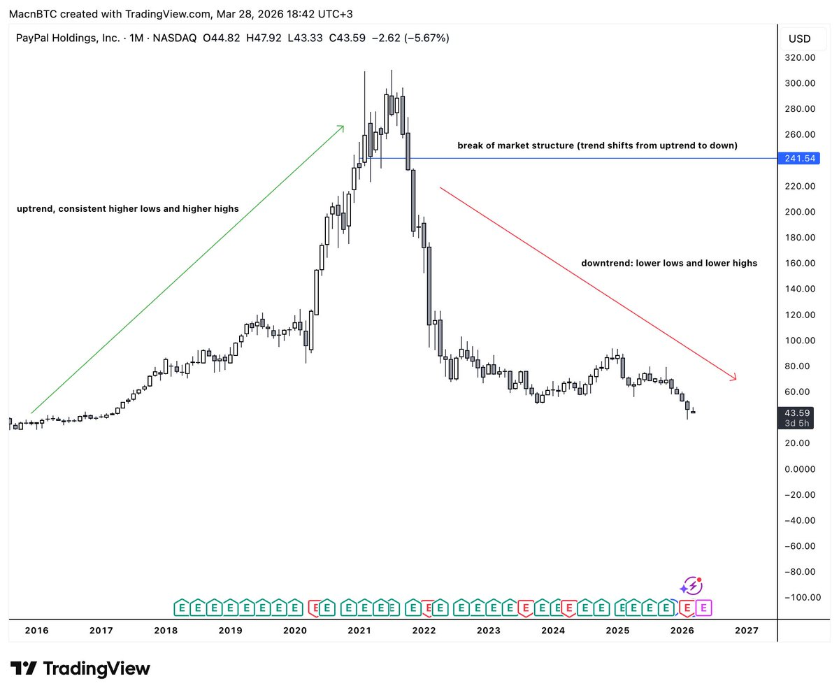 PYPL 的月线图是展示市场结构的绝佳例子。在左侧,可以看到一个清晰的上升趋势。K 线图正在走出更高的低点和更高的高点,价格持续上涨。