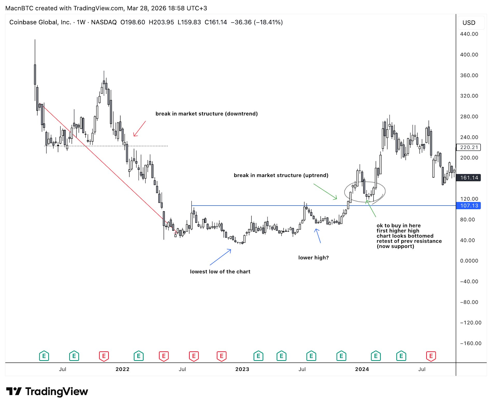 下面来看一下 Coinbase 周线图。