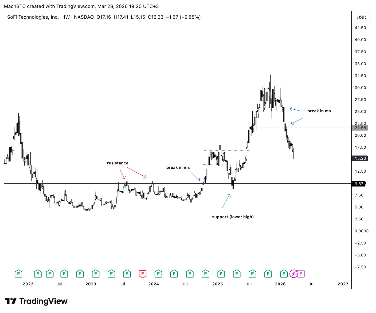 在 2021 年的峰值,可以看到市场结构发生了明显的破裂:图表不再创出更高的高点和更高的低点,而是跌破了 6 个月前的“更高的低点”。原本这个“更高的低点”应该能够守住,但它并没有。买方失去了控制,卖方占据了主导地位。这是一个明显的市场结构突破,它表明我们应该卖出,并且暂时不要碰它。(下跌趋势开始)