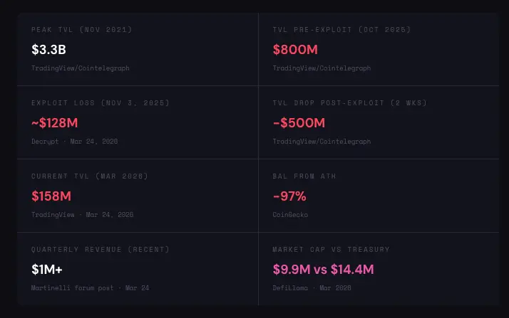 然后是黑客攻击。Balancer V2 兑换逻辑中的舍入漏洞在多条链上遭到利用,约 1.28 亿美元被盗。TVL 在两周内暴跌 5 亿美元。Balancer Labs 再次面临无法承受的法律风险。