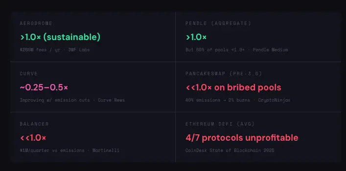 这里有个细节是 Pendle 退出时暴露出来的:总量比率会掩盖单个池子的真实情况。Pendle 整体的手续费效率超过 1.0x(收入大于增发),但当团队拆解到每个池子时,超过 60% 的池子单独核算是亏损的。少数表现突出的池子(可能是大型稳定币收益市场)在补贴其余所有的池子。手动 Gauge 投票把增发引向了对大投票者有利的池子,而不是产生最多手续费的池子。