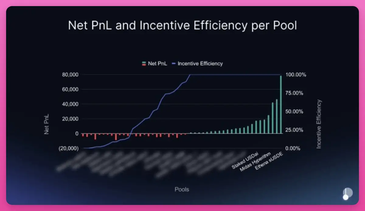 这个本该对齐激励的机制,把 80% 的持有者挡在了门外。真正触目惊心的是拆解到单个池子后的数据:超过 60% 接收增发奖励的池子单独来看是亏损的。少数高收益池在补贴大多数拖累整体的池子。由于投票权高度集中,增发奖励流向了大户持仓的地方——通常是各类包装资产——再由这些地方分配给终端用户。