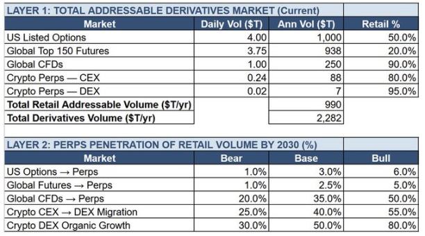 为更审慎地评估 HYPE 的合理价值,我们采用自下而上的估值方法,探讨以下问题:永续合约在全球衍生品市场中能够占据多大份额,而 Hyperliquid 又能够在这一市场中获取多少比例。