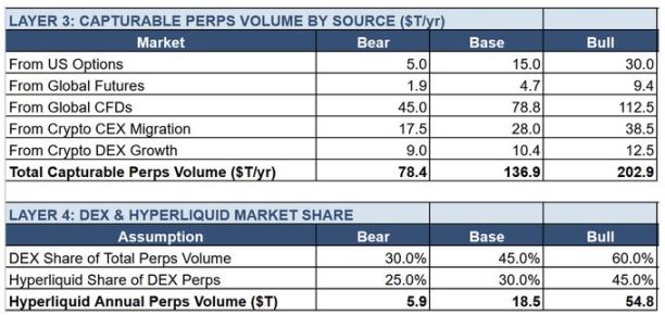 其次,该模型要求永续合约的整体潜在市场规模以超越任何可比市场的速度扩张。目前全球永续合约的年化交易总额约为 95 万亿美元,其中去中心化交易所永续合约占比约为 10%(约 7 万亿至 9 万亿美元)。截至 2026 年 3 月,Hyperliquid 在去中心化交易所永续合约市场中的占比约为 30%,对应年化交易额约 2 万亿美元。要使基准情形下的估值成立,Hyperliquid 的交易额需增长至每年 51 万亿美元(按 115 亿美元收入除以 2.25 个基点计算),约为当前水平的 25 倍。