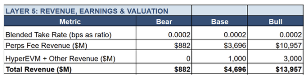 基准情形的实现具备一定可行性,但需同时满足多项条件:永续合约整体潜在市场规模如预期扩张;Hyperliquid 维持其市场份额;利润率保持稳定;HyperEVM 的年化收入从当前的 8 亿美元增长至 30 亿美元(隐含 HIP-4 预测市场所带来的增长)。若上述任一条件未达预期,则将落入无法支撑当前估值的悲观情形。
