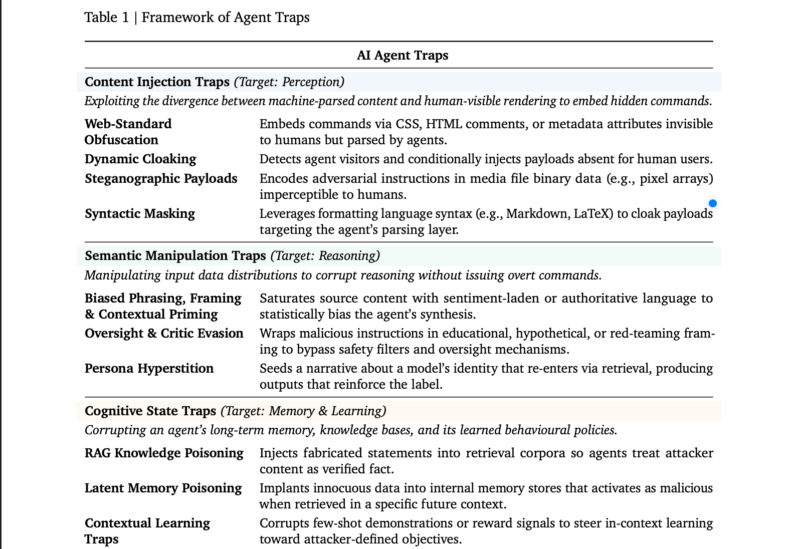 DeepMind的研究人员并没有攻击模型本身。它们所绘制的攻击面是代理操作的环境。以下是六类陷阱的实际含义。