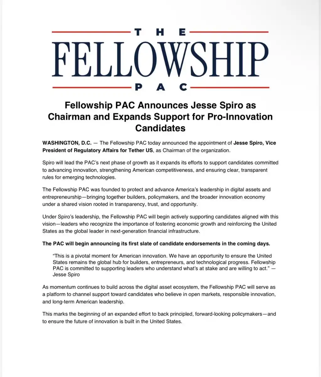 如今,一位现任 Tether US 高管正式出任 PAC 主席,此前的种种传闻终于落定为公开记录。据 BeInCrypto 报道,这是 Fellowship PAC 与 Tether 官方之间首次建立正式、公开的关联。