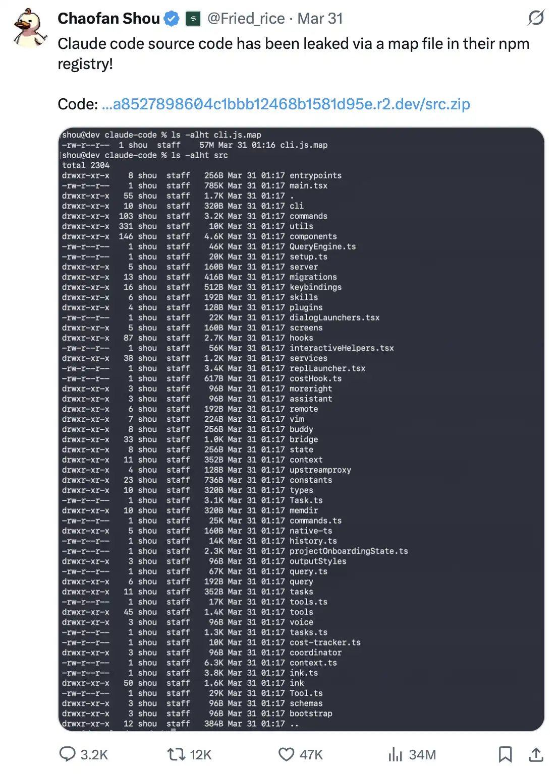 2026 年 3 月 31 日,区块链公司 Fuzzland 的安全研究员 Shou Chaofan 在检查官方发布的 Claude Code npm 包时,发现其中竟然明文包含一个名为 cli.js.map 的文件。