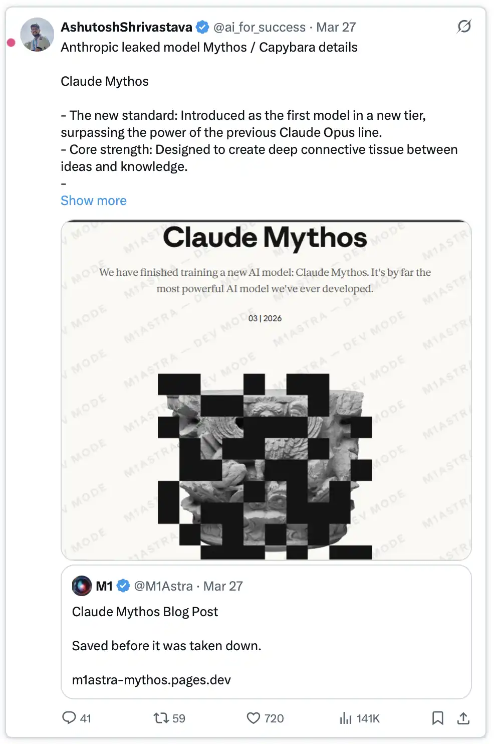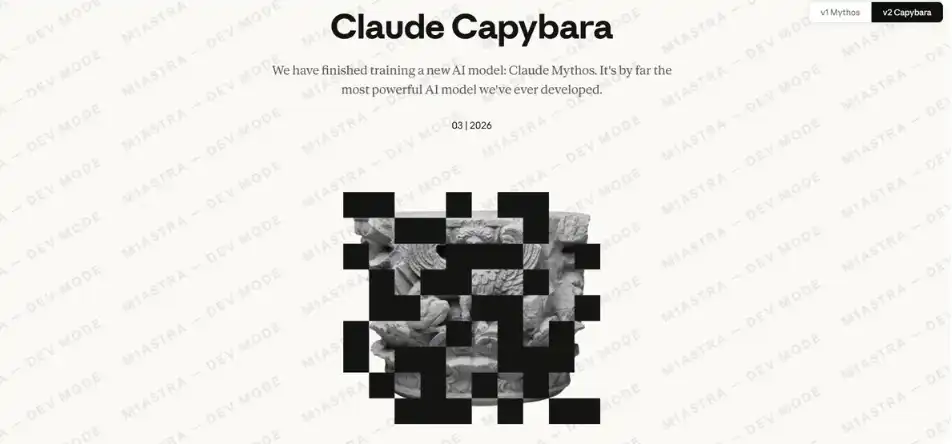 在这些文件中,有两份几乎完全相同的博客草稿,唯一的差别是模型名称:一份写着「Mythos」,另一份写着「Capybara」。