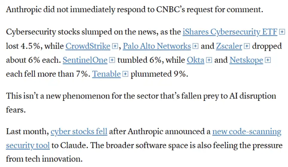 图中大意:在相关消息影响下,网络安全板块整体下跌,多家龙头公司(如 CrowdStrike、Palo Alto Networks、Zscaler 等)出现明显跌幅,反映出市场对 AI 冲击网络安全行业的担忧。但这种反应并非首次出现。此前 Anthropic 发布代码扫描工具时,相关股票也曾下跌,说明市场已经开始将 AI 视为对传统安全厂商的结构性威胁,整个软件行业都在承受类似压力。