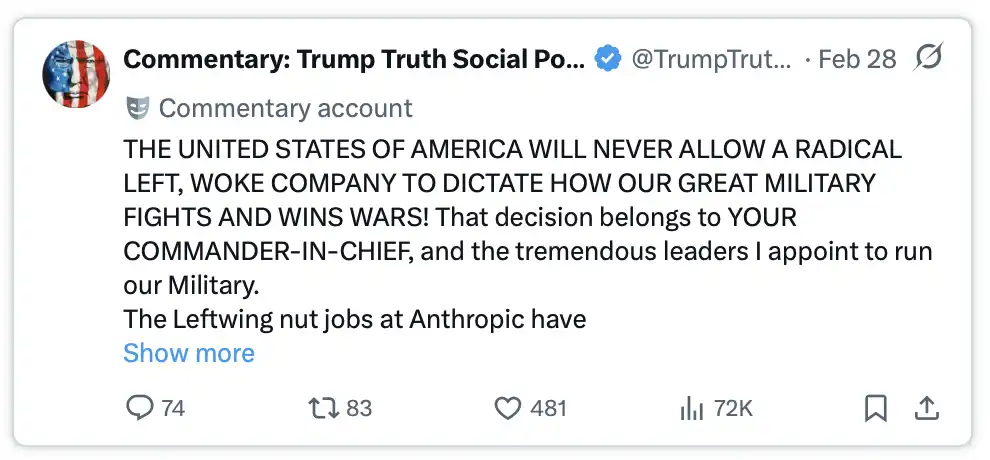 随后,局势开始迅速升级。2026 年 2 月 27 日,Donald Trump 在 Truth Social 上发文,要求所有联邦机构「立即停止」使用 Anthropic 的技术,并将该公司称为「激进左翼」。