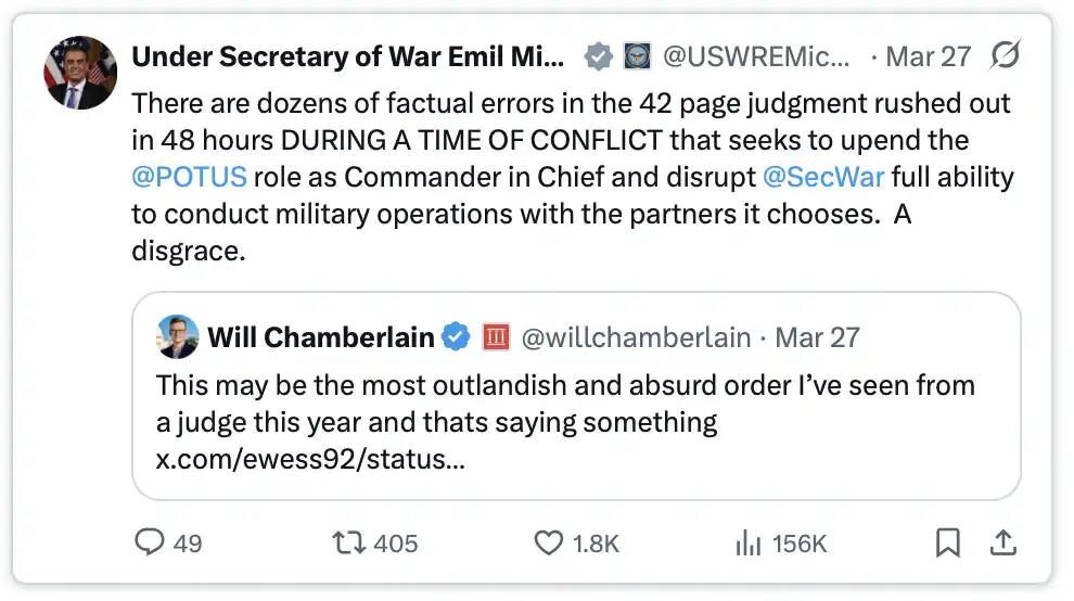 2026 年 3 月 26 日,联邦法官 Rita Lin 发布了一份长达 43 页的裁决,全面阻止了五角大楼的相关措施。