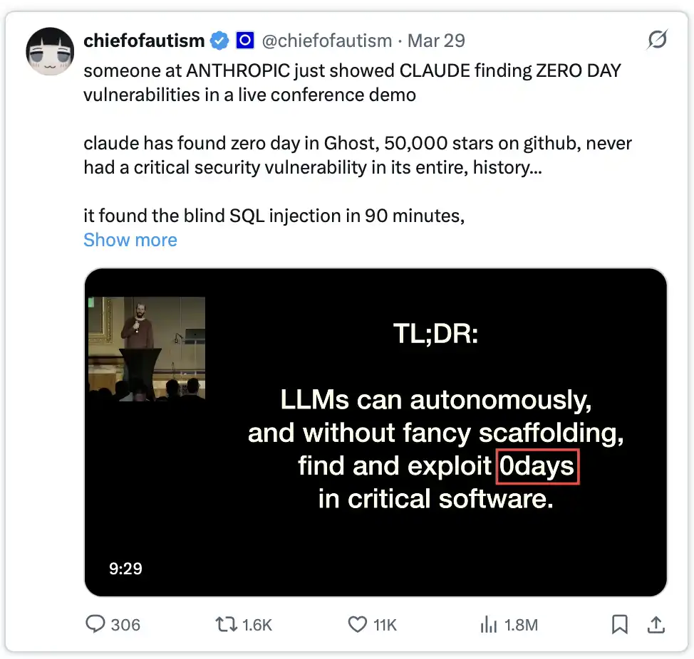 随后,在 RSA Conference 2026 上,研究员 Nicholas Carlini 登台演示。他将 Claude 对准 Ghost,一个在 GitHub 上拥有 5 万星标、历史上从未出现过严重漏洞的 CMS 系统。