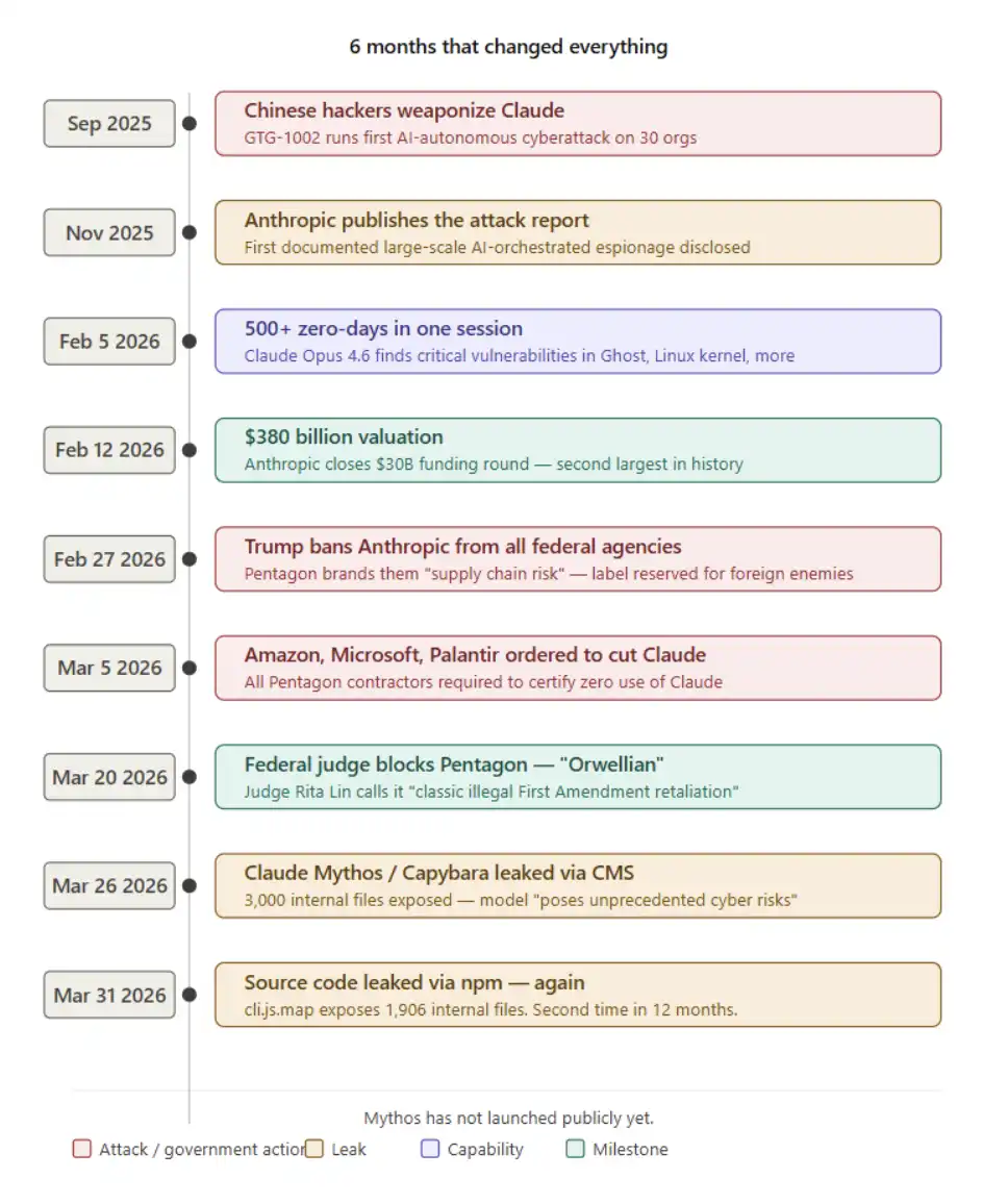编者按:过去半年,Anthropic 接连卷入一系列看似彼此独立、实则相互指向的事件:模型能力的跃迁、真实世界中的自动化攻击、资本市场的剧烈反应、与政府的公开冲突,以及多次由基础配置失误引发的信息泄露。将这些线索放在一起看,它们共同勾勒出一个更清晰的变化方向。