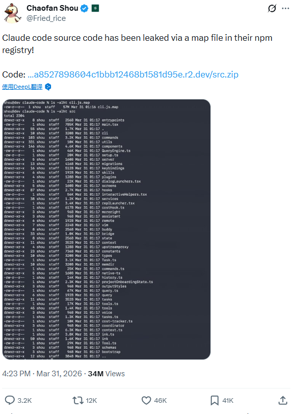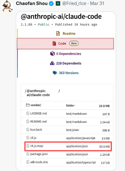 此次文件是用户 Chaofan Shou 在 X 上先放出来的。Anthropic 官方npm包@anthropic-ai/claude-code 的 2.1.88 版本里,带了一个大约 60MB 的cli.js.map。这个文件把文件名和源码内容一起带了出去。别人拿到以后,就能顺着往下提代码。几小时后,GitHub 上的镜像仓库已经冲到几千星。Anthropic 开始删文件、发 DMCA(依据美国版权法要求下架),传播还是拦不住。