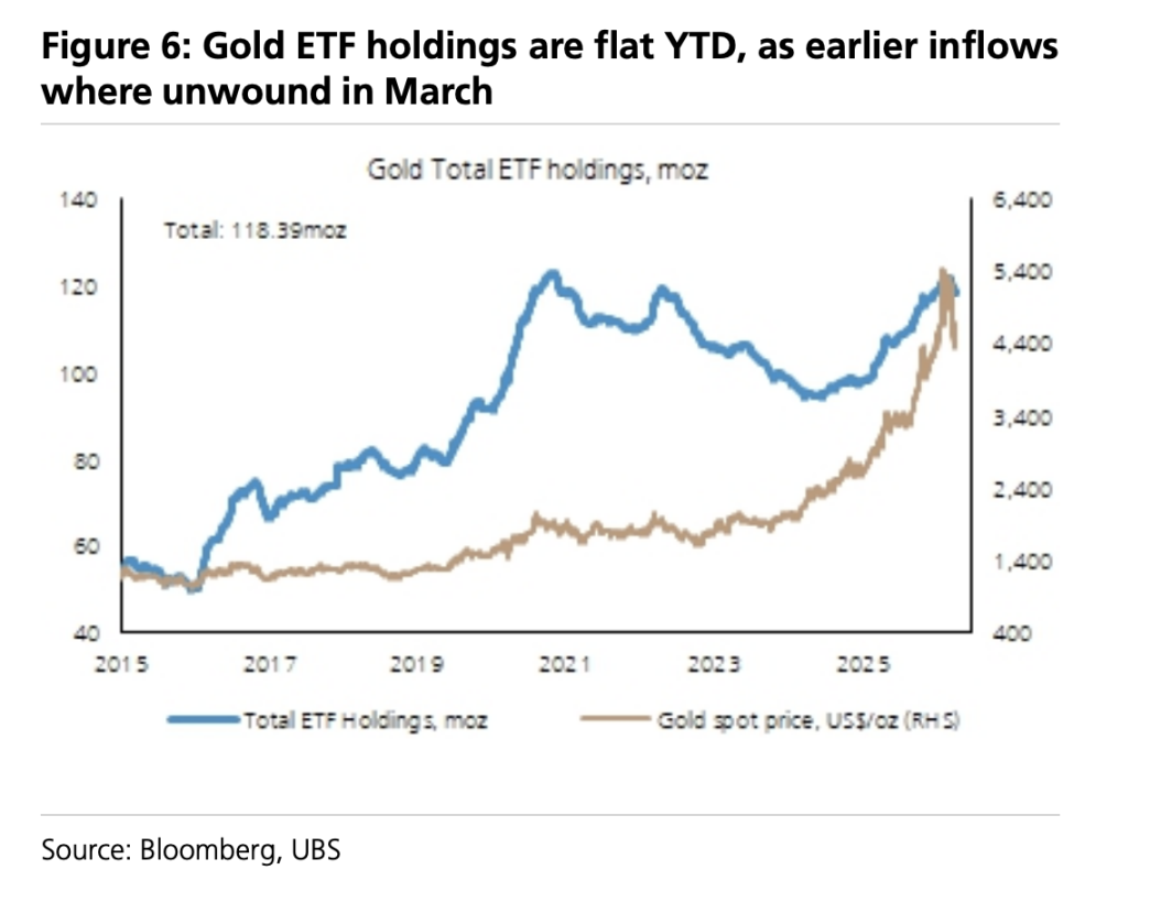 在价格层面,瑞银把短期定义为「噪音很多」:地缘局势的新闻循环会让金价继续震荡、盘整;但中期逻辑仍指向新高,并将 2026 年金价年均预测下调至 5000 美元(此前 5200 美元,主要是对一季度的账面调整),维持年底目标价 5600 美元(1 月底设定)。