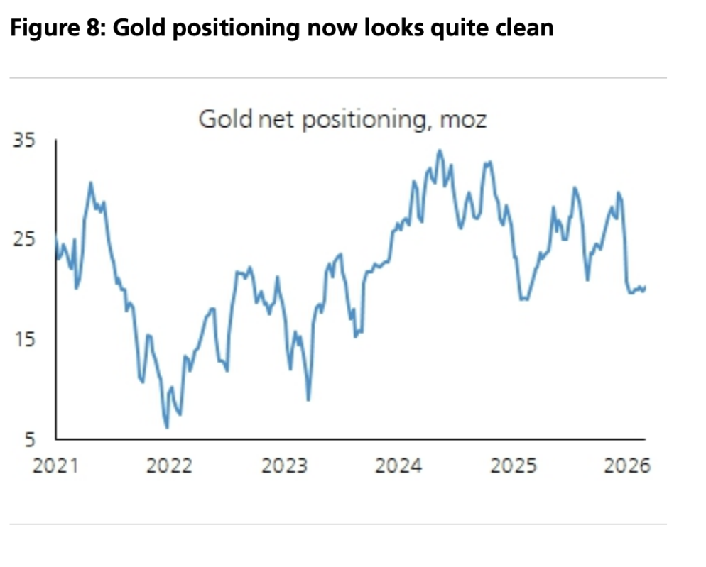 在这个框架下,报告给出的定价锚是:2026 年金价年均 5000 美元、年底目标 5600 美元。它同时提到,投机仓位已经「更干净」,而长期参与者仍偏低配;如果回撤再出现,更接近一种「战略建仓窗口」,而不是趋势终结的信号。