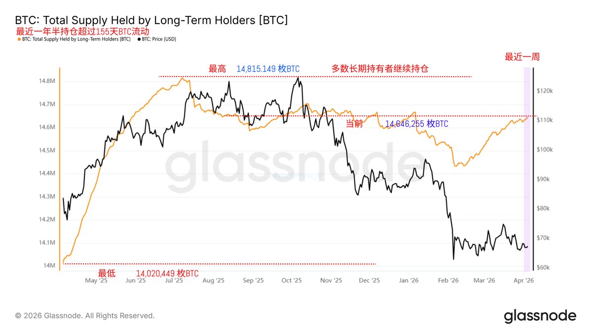 很遗憾 Bitcoin 没有锁仓这么一说,但是从持仓超过 155 天没有转移过的 BTC ,也就是超过 5 个月没有移动过的 BTC 来说,这个数据从今年 2月份 开始也就是 Bitcoin 跌破 70,000 美元的时候就开始是增加的。