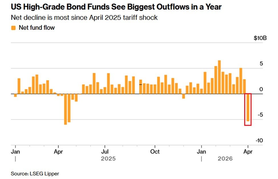 截至 4月1日 当周,美国高评级债券基金净流出大约 53.5 亿美元,是近一年来最大单周流出,也是自 2025年4月 以来最差的一次。同时美国债券基金整体也出现了大约 101.7 亿美元的净流出,而货币市场基金则继续吸引资金流入。