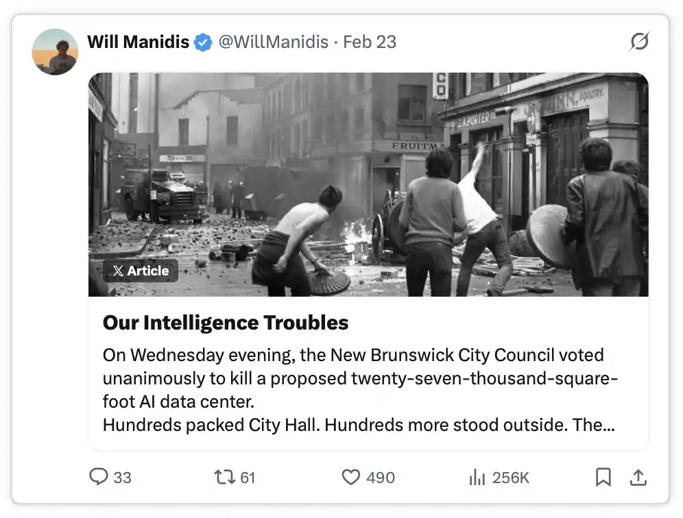 与此同时,现实中的反作用力已经出现:从地方层面的数据中心阻力,到跨州立法与社区组织,AI 的成本正在被具体的人群所感知与承受,而收益却高度集中于少数公司。这种不对称,正在转化为政治问题。