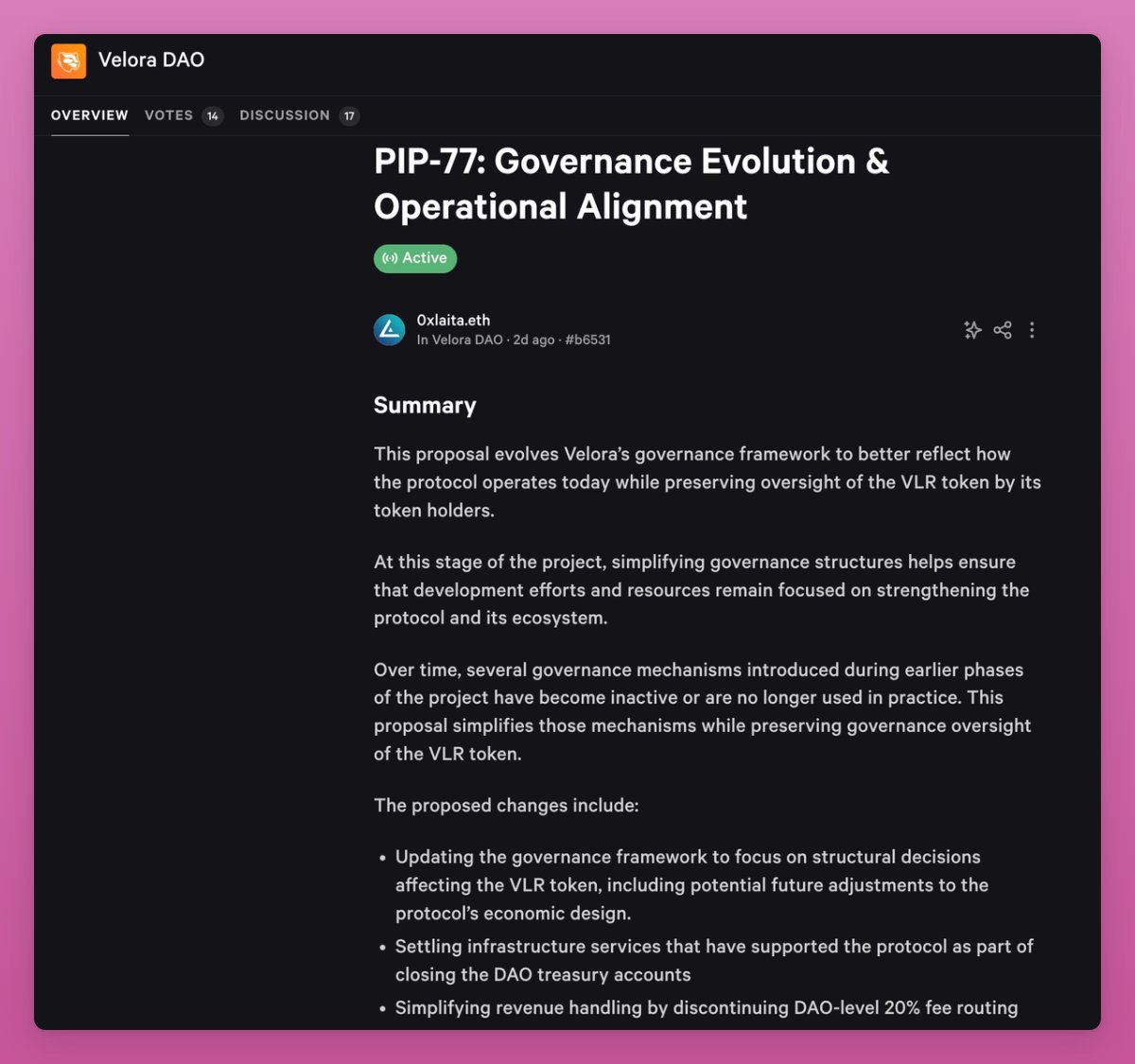 另一个解散其DAO运营的DAO:Velora(之前的Paraswap)变化如下:- DAO治理停止