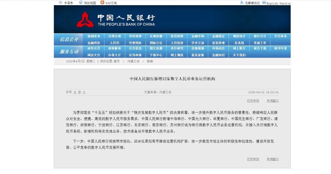 2026年4月2日,中国人民银行网站发布了一则消息:新增12家银行类数字人民币业务运营机构,并接入央行端数字人民币系统。消息一经发出,数字人民币业务运营机构从10家增至22家。这看似只是一次官方公告,背后却隐藏着中国法定数字货币走向规模普及的关键转折。