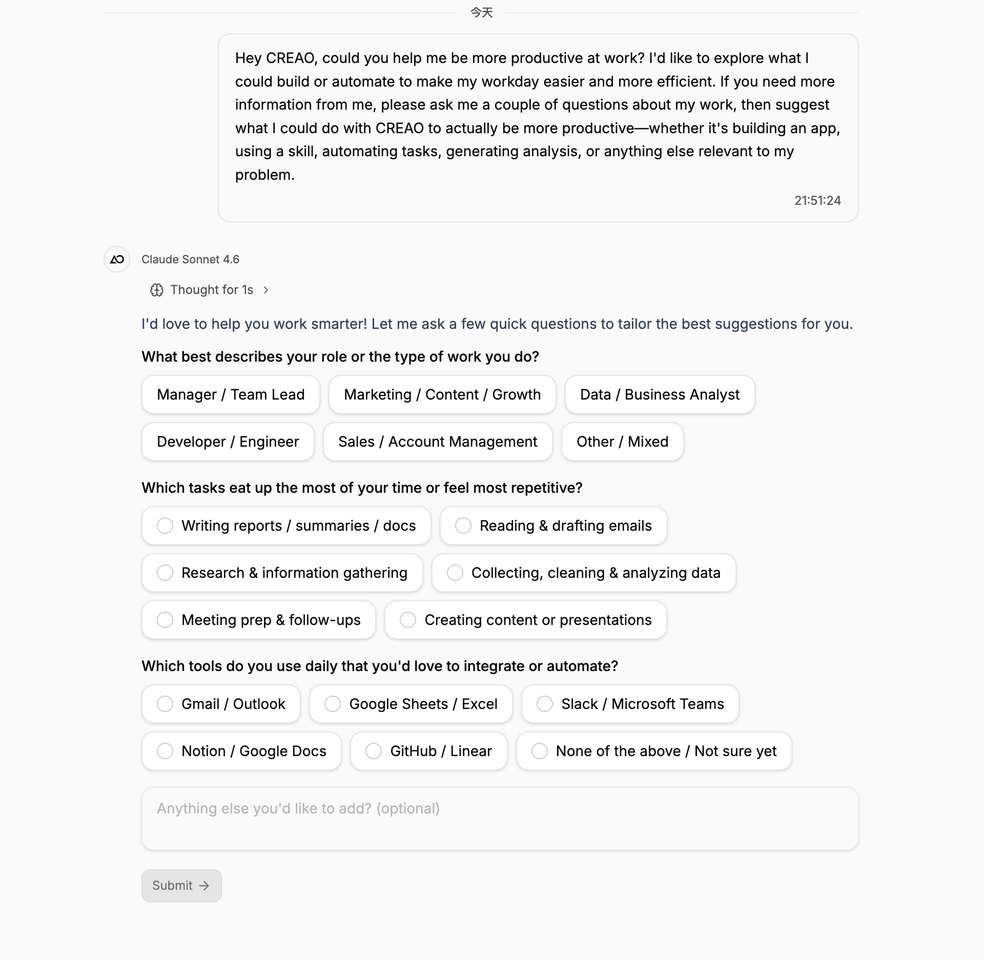 我也注意到一个有意思的对比。如果你去看那些追求通用 Agent 的产品,他们的演示案例通常是"AI 帮你完成了一个复杂的开发任务"或者"AI 自主分析了一个商业问题并给出方案"。这些案例很震撼,但很难复制。普通用户看完会觉得"哇,好厉害",但不知道怎么把它应用到自己的工作中。而 CREAO 的使用场景都非常具体:监控竞品价格、同步数据到表格、定时发送报告、整理邮件、管理待办事项。这些都是每个人每天都在做的事情,只不过现在可以自动化了。这种产品定位的差异,决定了 CREAO 天然地拥有更广阔的用户群。