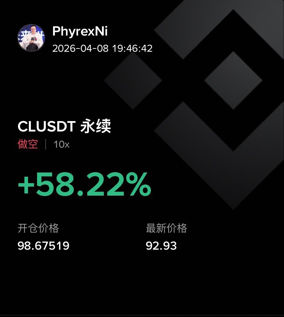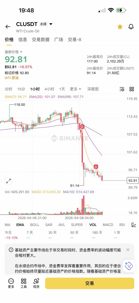 其次迅速做空 WTI (CLUSDT),因为相比于 Bitcoin 来说,美油还是在价格高点,当时刚刚跌破 100 美元,而打仗前 美油 的价格在 80 美元以下,相对于上涨空间受到美联储限制的 BTC 来说,美油的下跌空间更大,确定性机会更强。