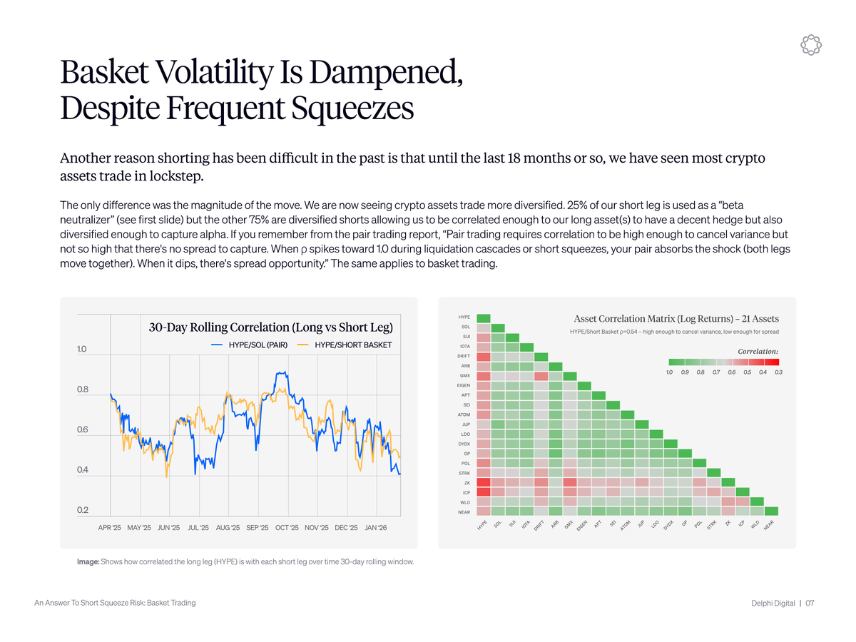 结果是,这个篮子的波动性低于HYPE/SOL配对交易,尽管其20个空头腿每一个都可能单独被挤压。相比于裸体HYPE,篮子的最大回撤压缩到-15%,而HYPE则为-48%。