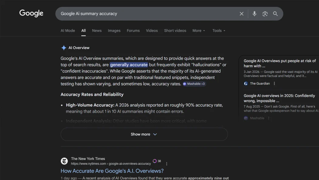 深潮导读:《纽约时报》联合 AI 初创公司 Oumi 的最新测试显示,Google 搜索的 AI 摘要功能(AI Overviews)准确率约为 91%,但以 Google 年处理 5 万亿次搜索的体量换算,这意味着每小时产生数千万条错误答案。更棘手的是,即便答案正确,超过半数的引用链接也无法支撑其结论。