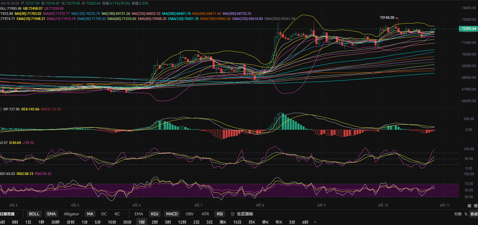比特币中历辉昨日早间布局70800下方多,日内冲高73100上方后拿下2300点!今日凌晨行情形成震荡回落至1小时下轨与MA60再次形成支撑反弹,当前k线位于1小时通道布林带中轨上方靠进上轨位置,MACD中0轴下方持续缩量,快慢线收口成型即将形成金叉意向,KDJ三线低位交叉向上接近100,正在形成超买现象,RSI三线上行接近65,表明短期行情还处于多头趋势,行情二次上攻上轨与昨日高点区间可能!
