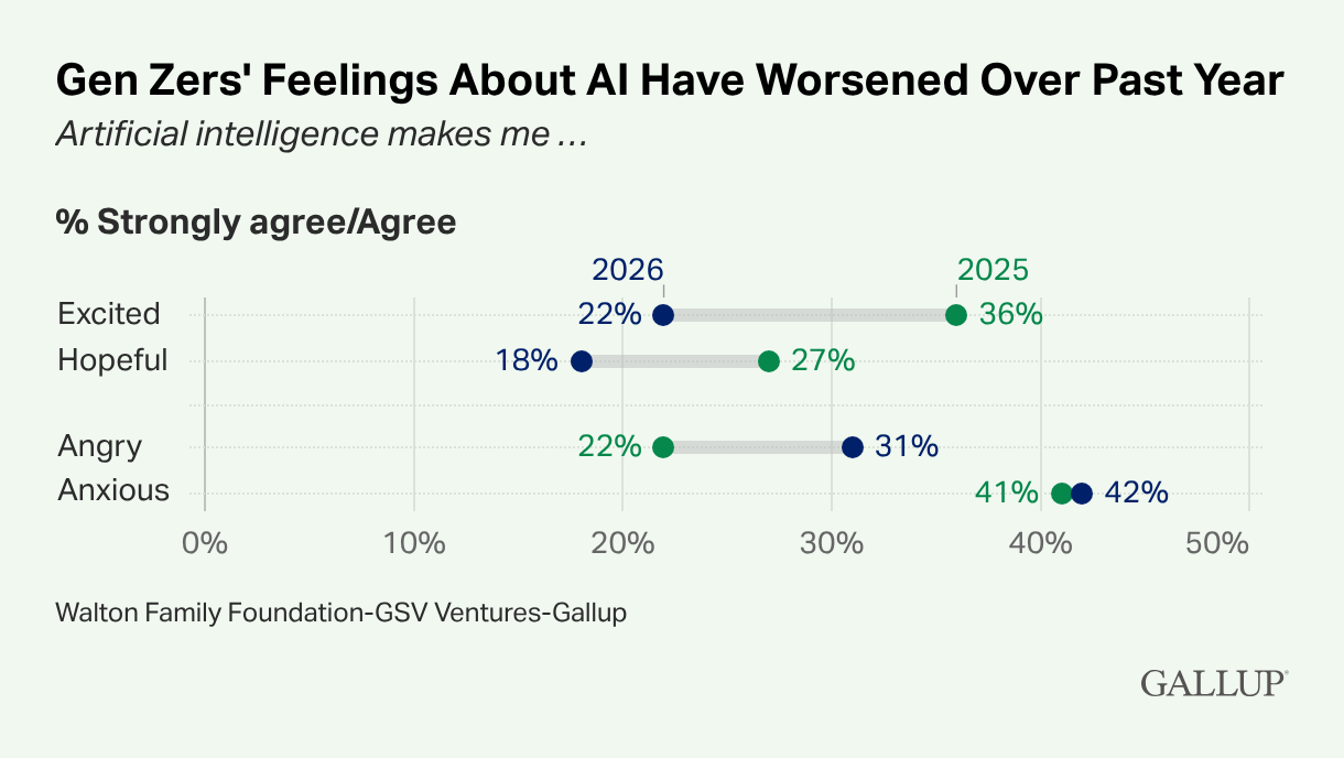 而这种负面情绪甚至扩展到了更为核心的用户。在每天使用人工智能的Z世代中,兴奋度同比下降了18个百分点。“在大多数情况下,Z世代逐渐变得更加怀疑、更加消极——在去年的时候,他们对这件事并不是特别积极,”盖洛普高级教育研究员扎克·赫里诺夫斯基说。