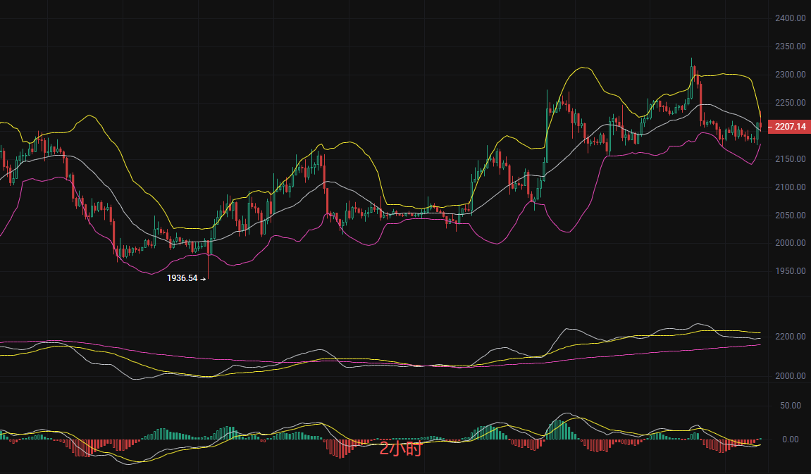 2小时图中价格运行在MA7=2194与MA30=2220区间,MA120=2160构成下方强支撑。MACD双线在零轴下方趋于粘合,绿柱小幅收量,下跌动能减弱。价格在2160-2220区间形成箱体震荡,布林带收口走平,短期方向不明。15分钟在2180-2215区间构筑震荡平台。MACD在零轴附近反复交叉,动能指标偏中性。上方2215为小级别阻力,下方2195为短期支撑。量能持续萎缩,市场观望情绪浓厚,需等待突破信号。