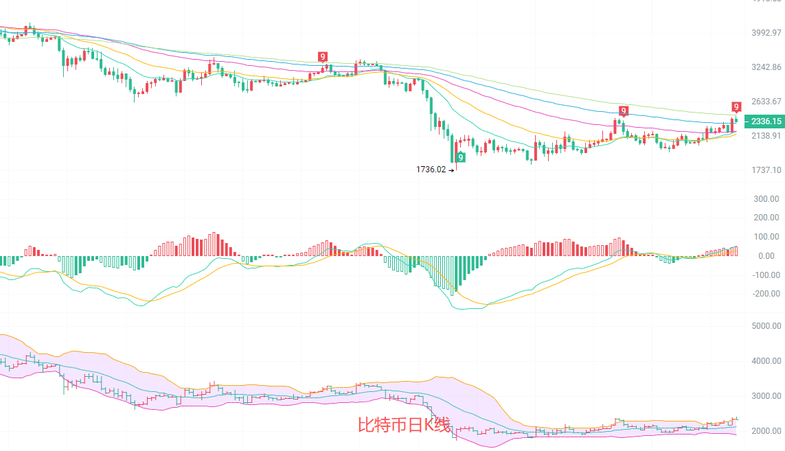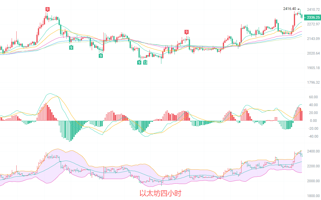 日K线1736的低点回升后,成功站上多条EMA均线,形成了明显的筑底回升形态。MACD红柱持续放大,多头动能占据主导,DIF与DEA在零轴上方持续上行,未出现拐头迹象;布林带由收敛转为开口,价格向布林上轨靠拢,说明日线级别的上涨趋势正在延续,下方关键支撑位于布林中轨附近的2160,不破则多头趋势难反转。