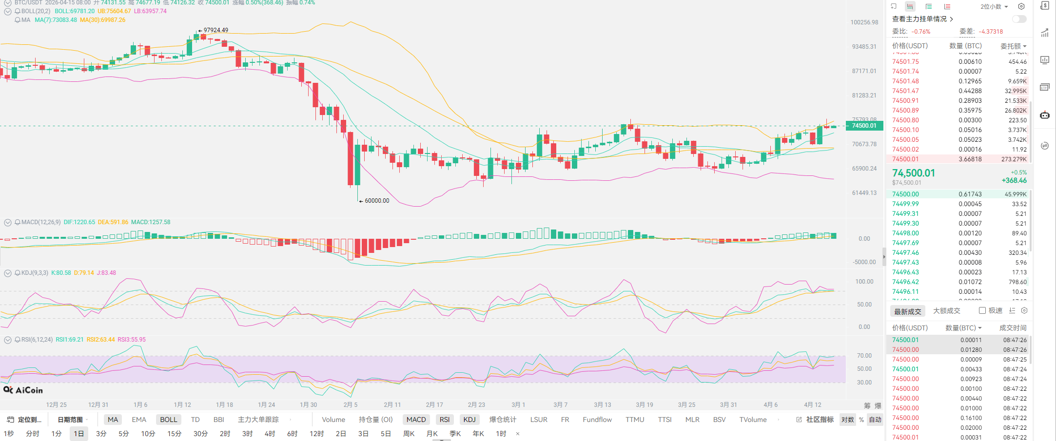 昨日聊完74000关口的压力,一鼓作气顺势突破76000关口,目前处于冲高回调阶段,维持在74500附近波动。还是先聊一聊消息层面,昨日透露出美伊下一轮的谈判节点,川普于4月13日对媒体表示,伊朗当天上午主动联系了美方,并称伊朗“急切地渴望达成协议”。并且释放出4月21日的停火协议有望得到延展,那么军事层面的动向对于金融来讲算是一个短期的利好。而最为关键的推手则是X产品负责人兼Solana生态顾问Nikita Bier 宣布,X在美国和加拿大的iPhone端上线Cashtags 功能,支持股票和加密代币实时行情。用户可通过搜索或发布Cashtag查看资产价格图表及相关讨论内容,无需离开平台。此外,X与加拿大券商Wealthsimple试点集成,允许加拿大用户直接在Cashtags页面完成交易。这是我们三月着重关注的消息面,目前正在落实。