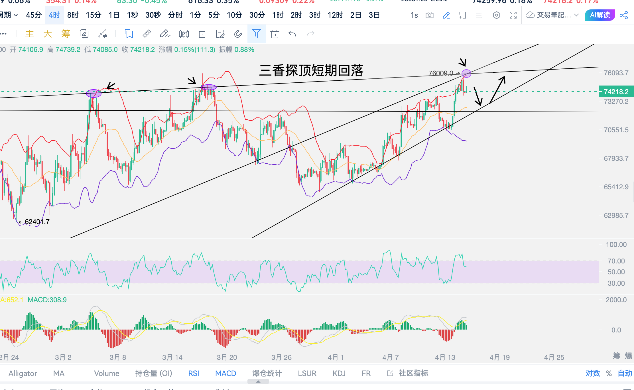 昨日比特币上探76000关口然后受阻回落,是到顶了,还是回落震荡修复蓄力走突破,行情价格不可能一直涨,也不会一直跌,盘面整体还是保持震荡上行状态
