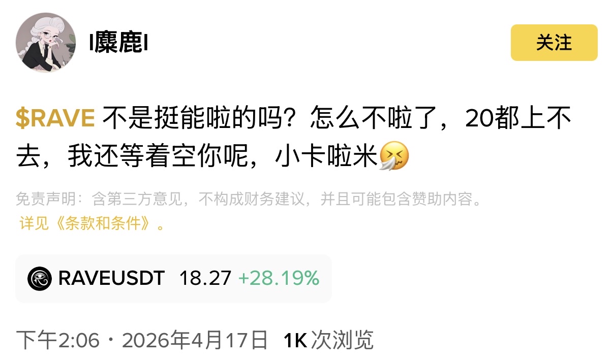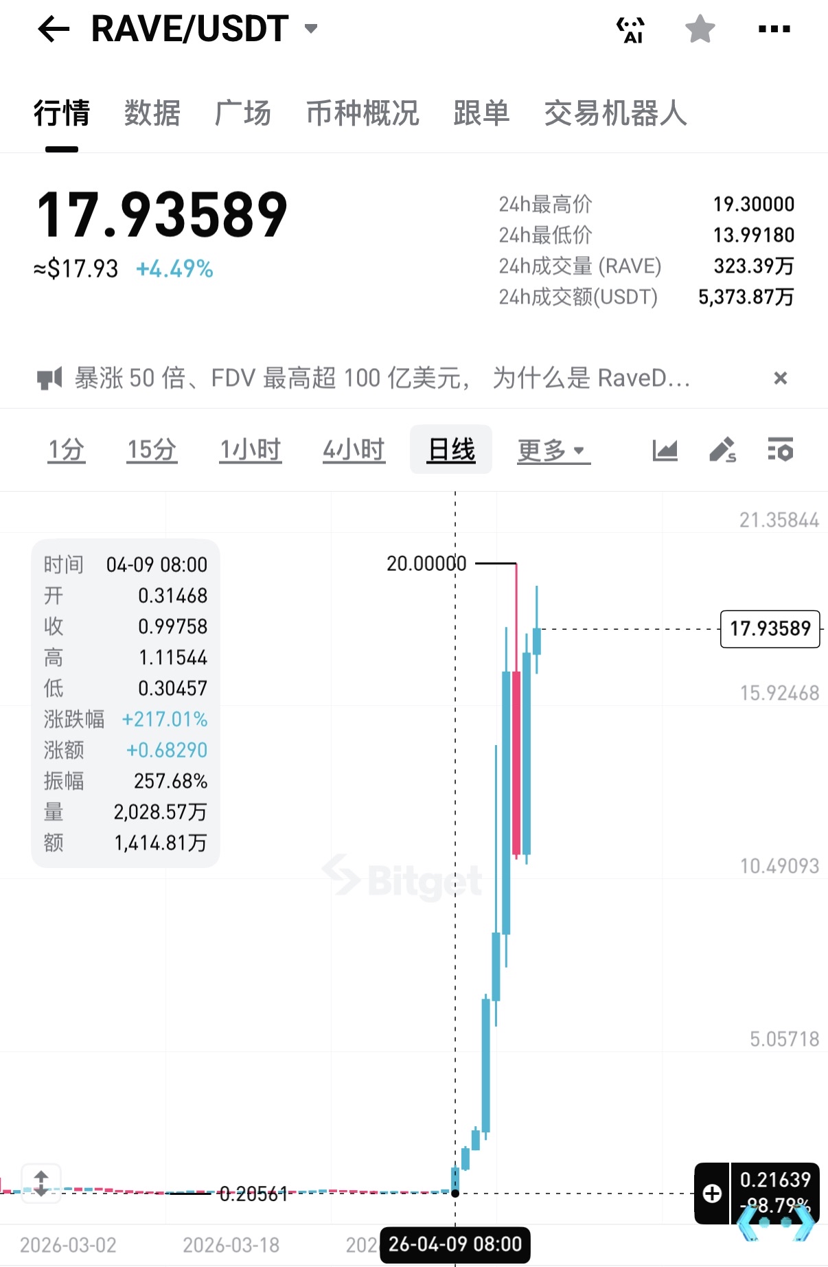 4 月 9 日到 17 日,RAVE 代币从 0.314 美元一路狂飙至 19.3 美元,涨幅超过 60 倍。
