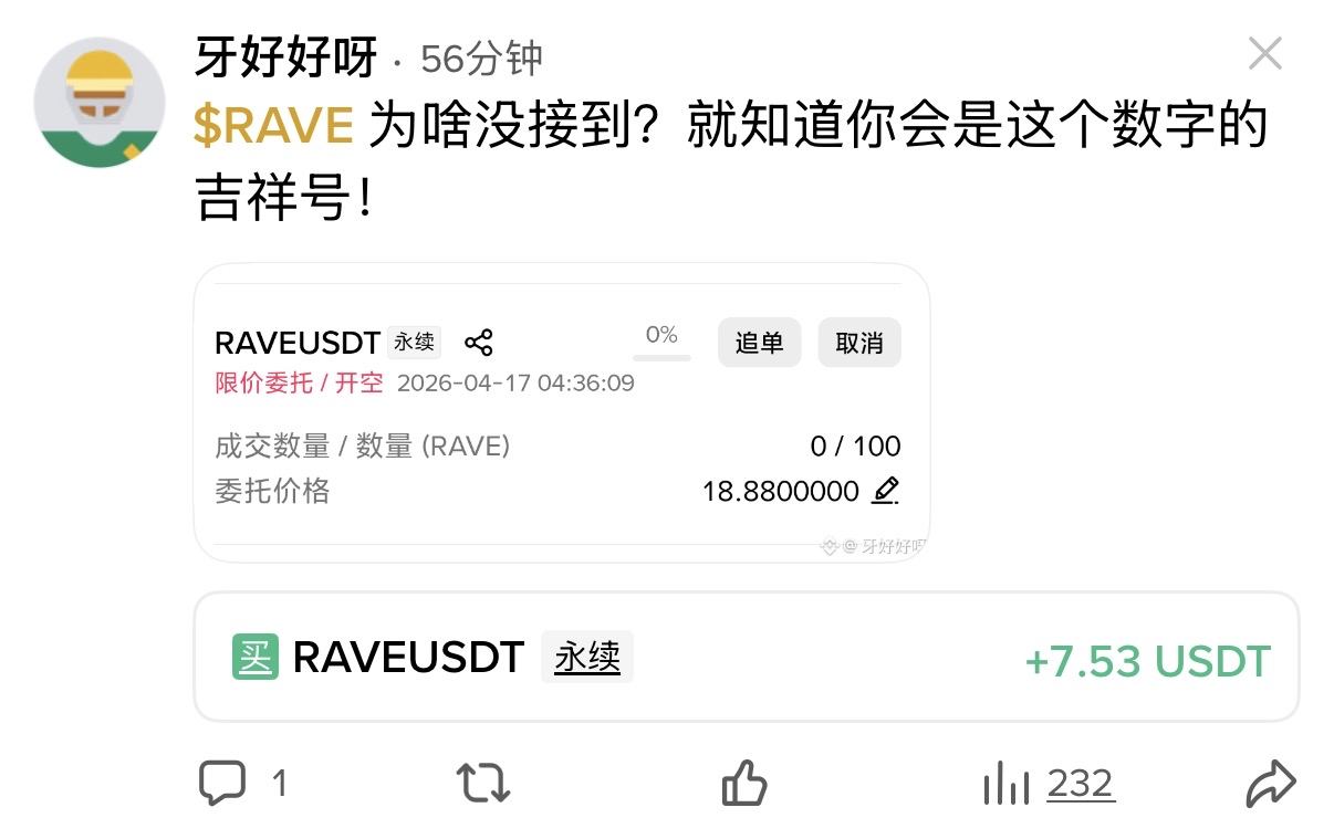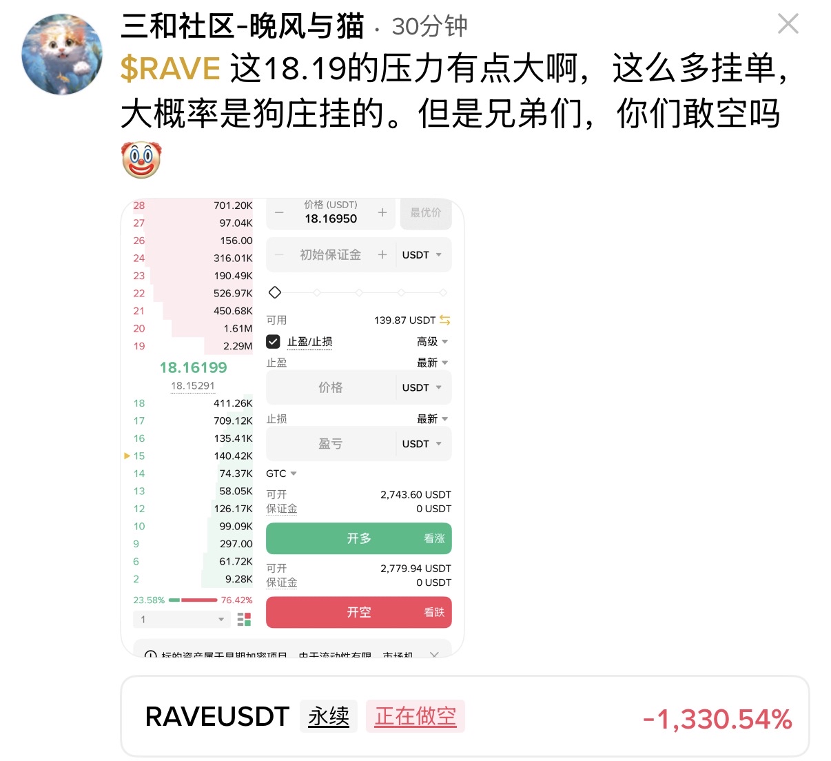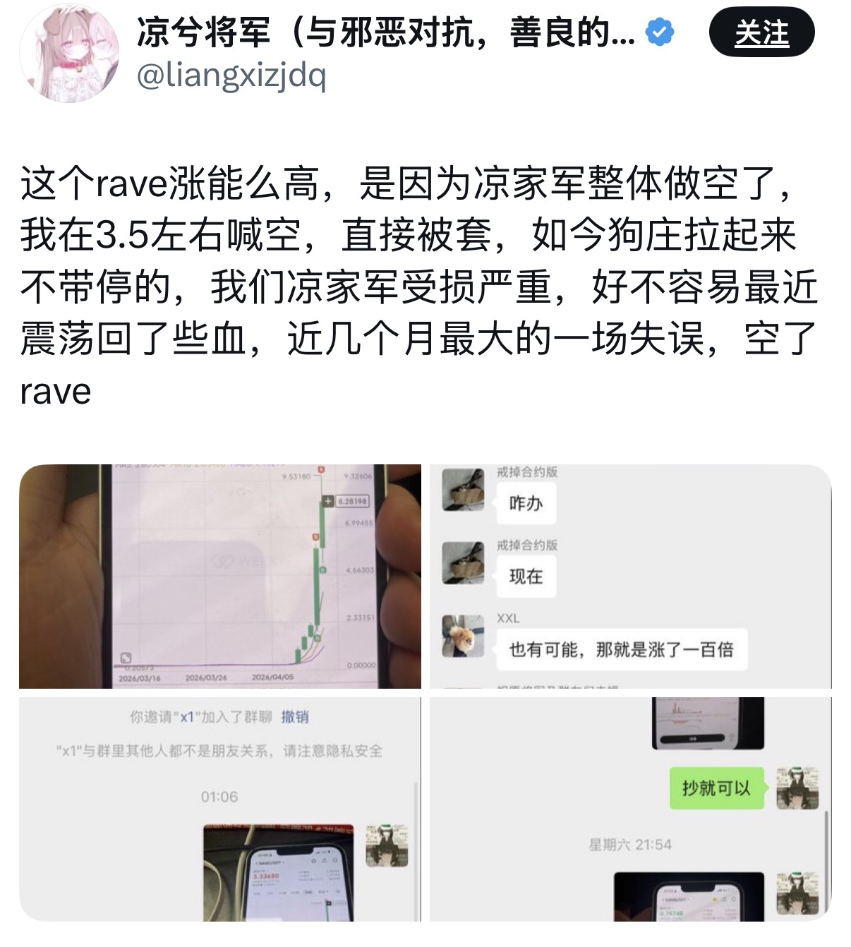 博主凉兮将军表示,RAVE 的上涨主要原因是「凉家军」整体做空了🤔。