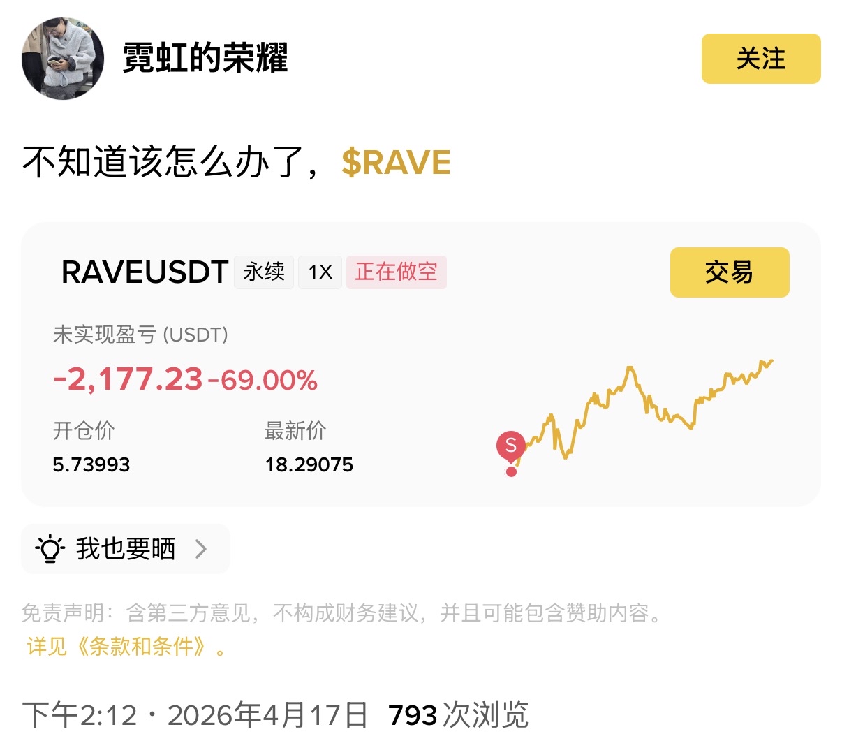 在 5.73 美元做空 RAVE 的网友已经不知道该怎么办了🥹,幸好是 1 倍杠杆。