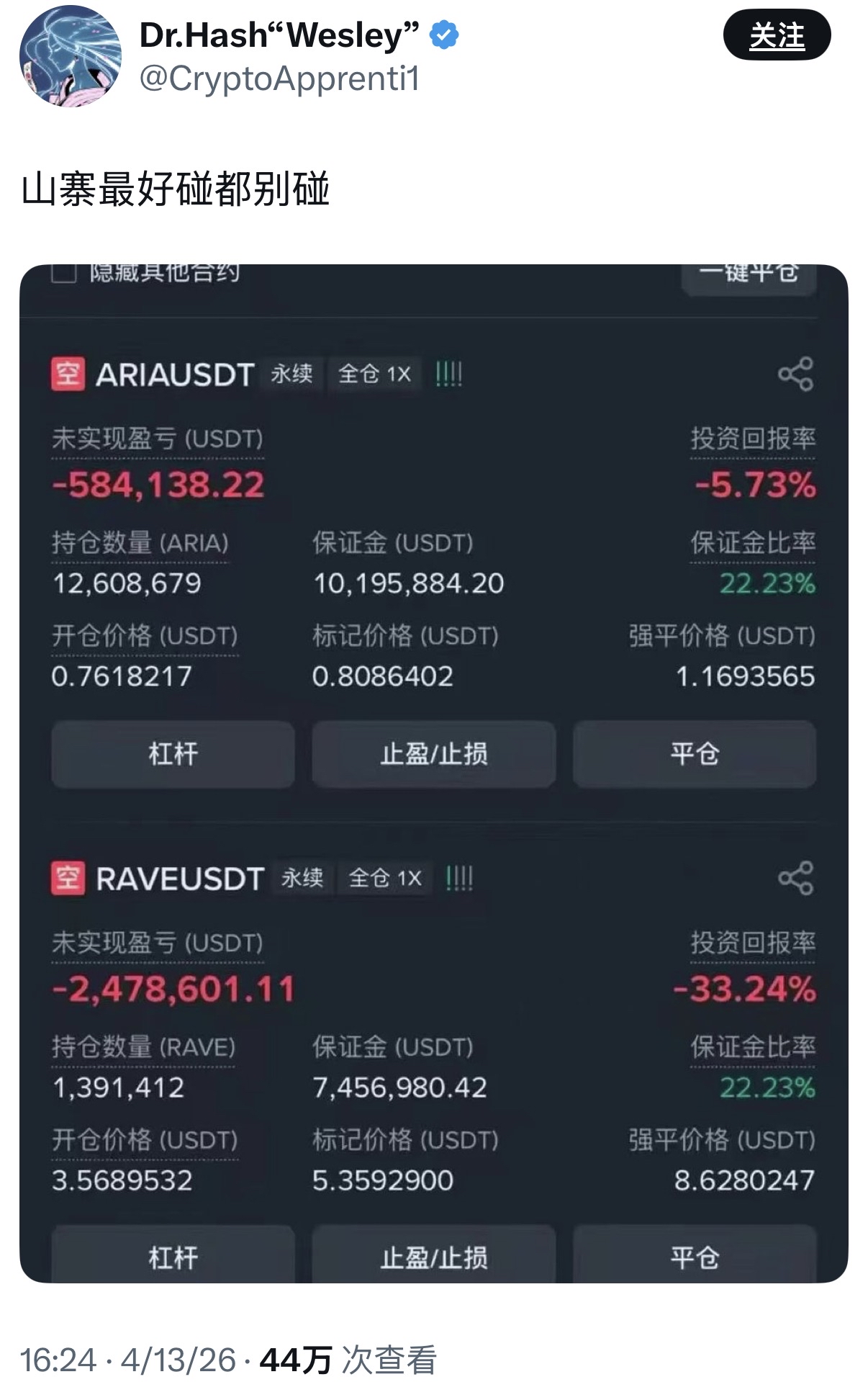 博主 Welsey 发布了一张做空 RAVE 的截图,在 5.35 美元的价格已亏损近 250 万美元。