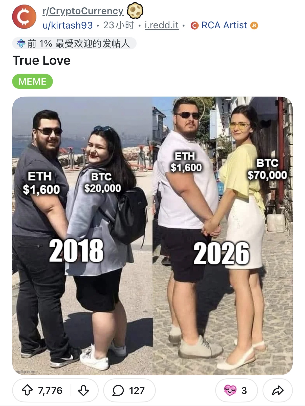 2026 年的照片里,同样的两个人,标签变了:男主:ETH $1600(纹丝不动),女主:BTC $70000,而女主变得苗条、有气质,男主……还是那个体型。