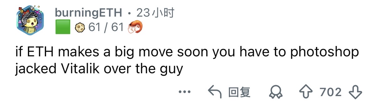 网友评论称,如果 ETH 很快有大动作,你就得把肌肉发达💪的 Vitalik(以太坊创始人)P 到那个家伙身上。