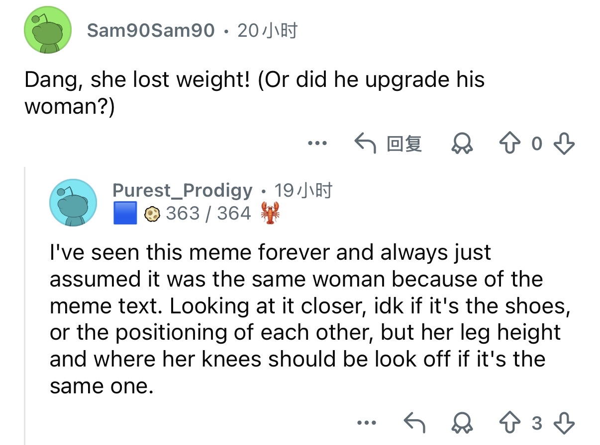 评论区有位细心的网友回复称,这个 Meme 图我看了很久了,一直以为是因为文字说明所以是同一个女人。仔细看的话,不管是鞋子,还是她们的相对位置,她的腿长和膝盖应该在的位置,如果是同一个人的话看起来都不对劲。