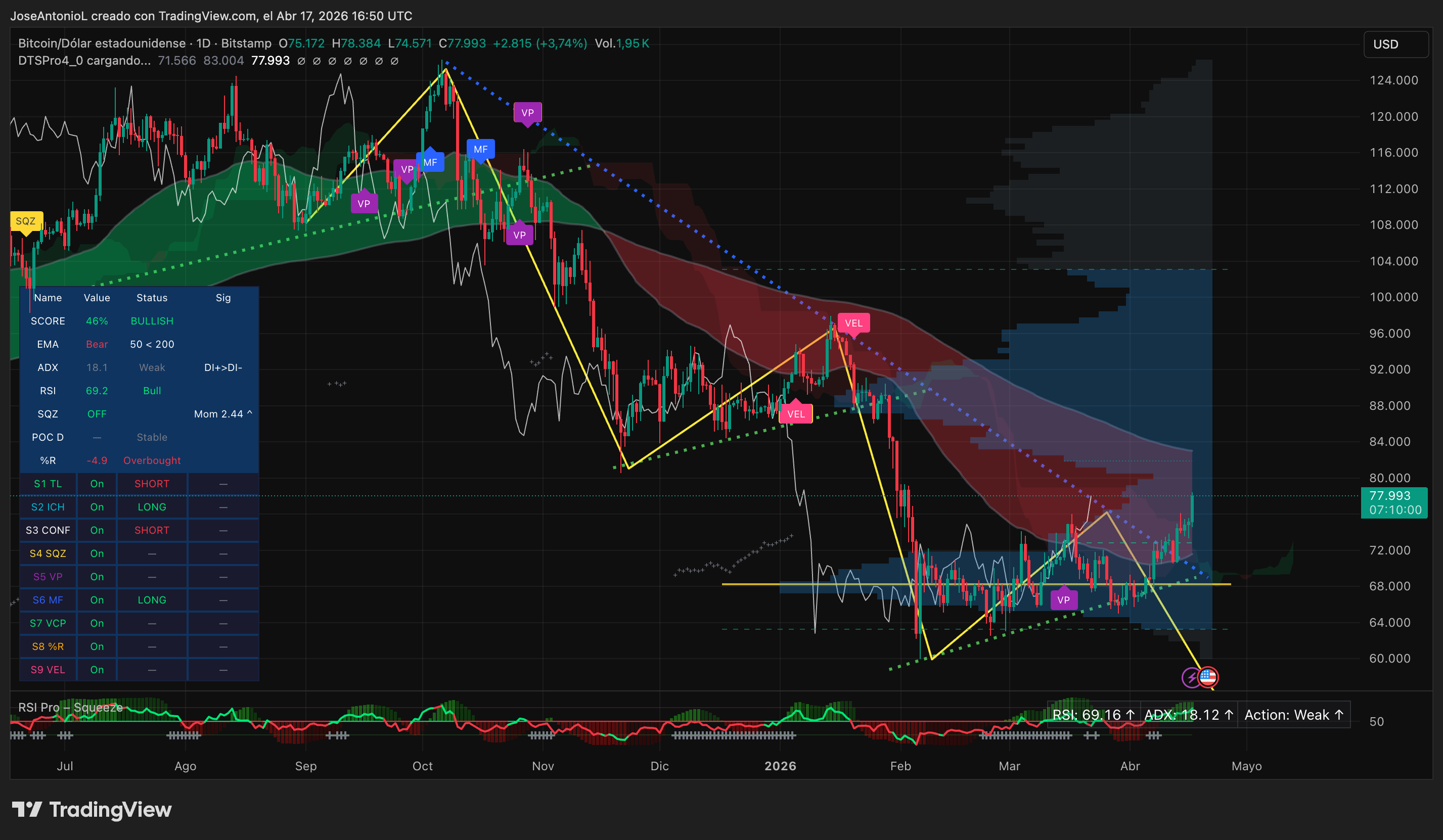 自$126,000历史高点以来,Bitcoin描绘了一条教科书式的下降通道——更低的高点、更低的低点,以及一连串被拒绝的突破尝试,每一次都比上一次更难突破。上图中的黄色趋势线显示,数月以来,Bitcoin形成了一种压缩结构,每一次反弹都在变浅,每一次支撑都被深度测试。