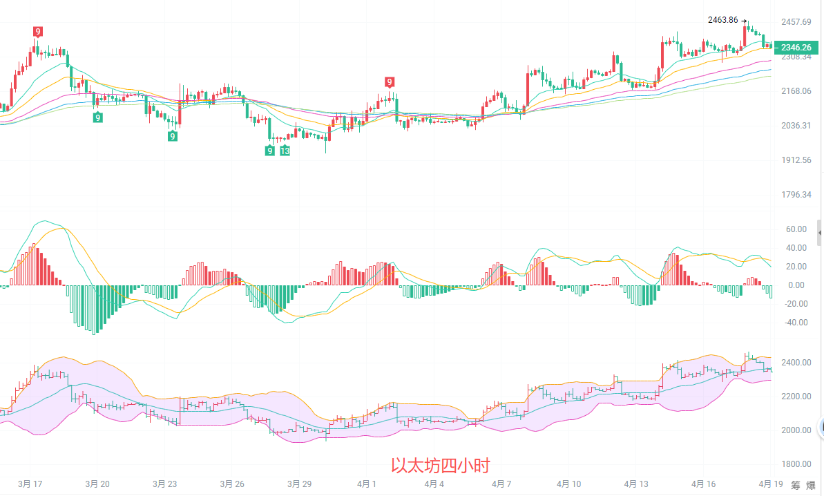 四小时形成双顶雏形,目前跌破EMA15均线,在EMA30均线附近震荡,布林带上轨压制明显。MACD指标死叉形成,绿柱开始放量,短期南下力量占优,布林带中轨2365附近支撑若失守,或进一步回踩2290一线。当前走势属于上涨后的回调修正,未出现明确反转信号前需警惕回调加深的风险。暂按震荡思路操作。