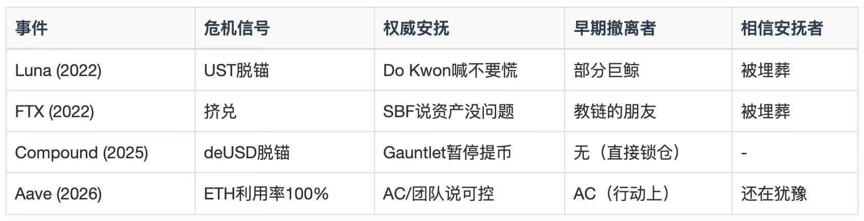 第一条:不立危墙之下。 出现异常信号,优先假设墙会倒,先撤离。墙没倒,你损失的是一点 Gas 费和几天利息。墙真倒了,你保住的是全部本金。